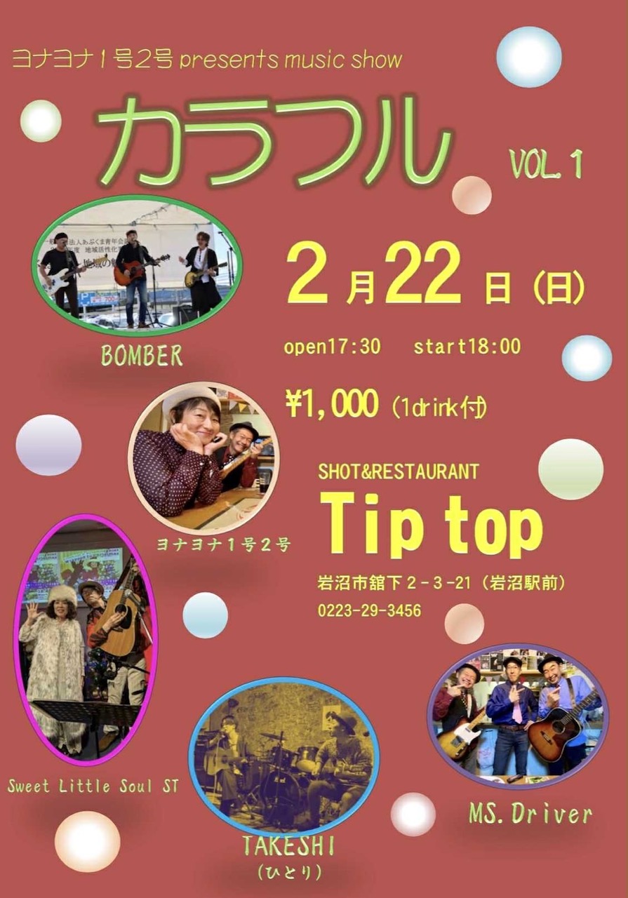 カラフル Vol 1 - ヨナヨナ1号2号 presents music show -SHOT&RESTRANT Tip top(チップ トップ) ●日程:2月22日(日) ●場所:SHOT&RESTRANT Tip top(チップ トップ) ●Open 17:30 Start 18:00 ●出演:MS.Driver / TAKESHI / ヨナヨナ1号2号 / BOMBER / Sweet Little Soul ●Fee:1000円(1ドリンク付き) |